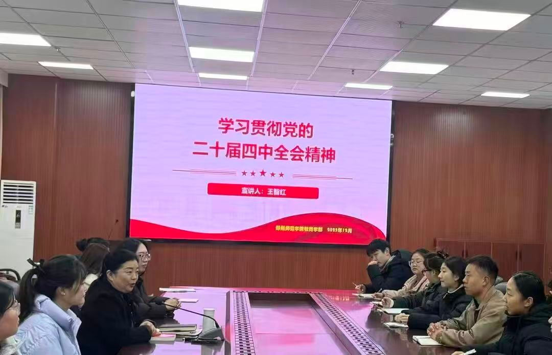 为深入学习贯彻党的二十届四中全会精神,推动全会精神进校园、进课堂、进头脑,12月31日上午,教育学部在尚志楼708会议室开展党的二十届四中全会精神宣讲暨“我与书记面对面”主题交流活动。教育学部党委书记王智红主讲,我院部分老师与学生干部代表参加。