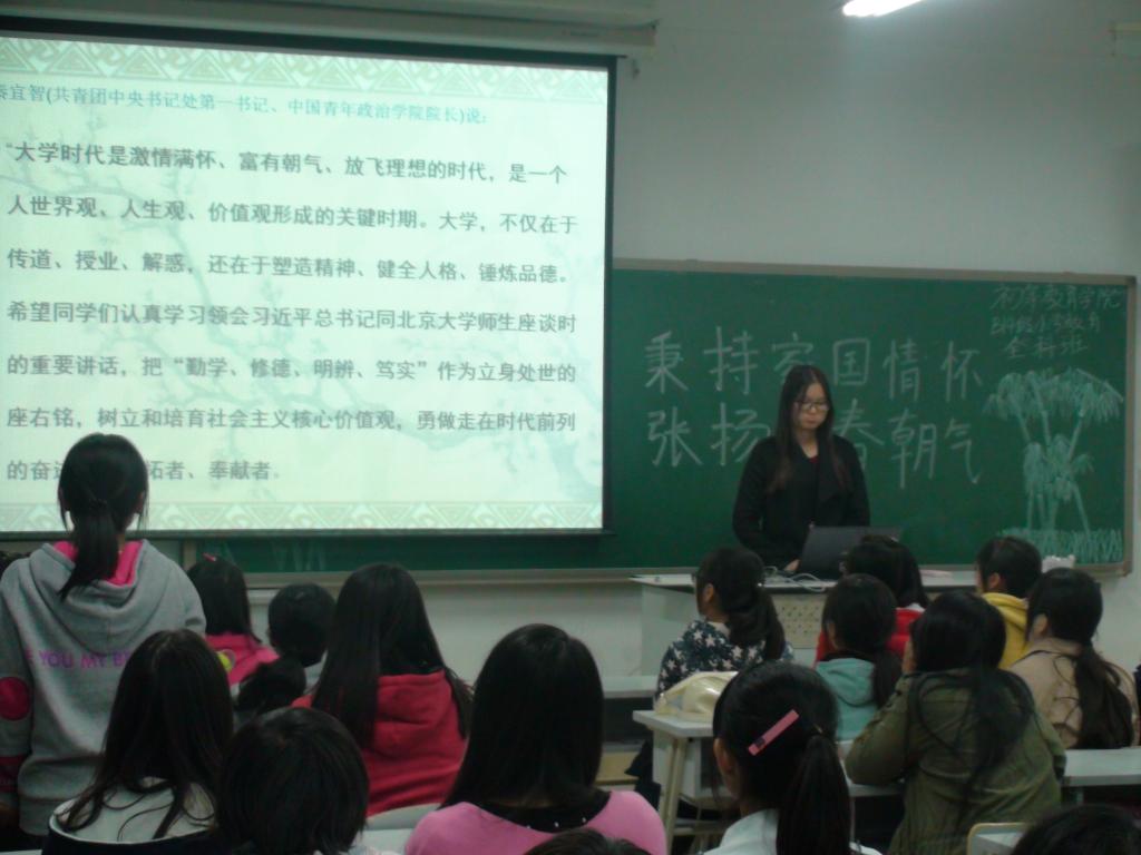 10月28日晚,初教院14级新生在七号教学楼开展了以“秉持家国情怀,弘扬青春朝气”为主题的政治学习活动。各班会议都在同学们的积极参与下顺利进行。
