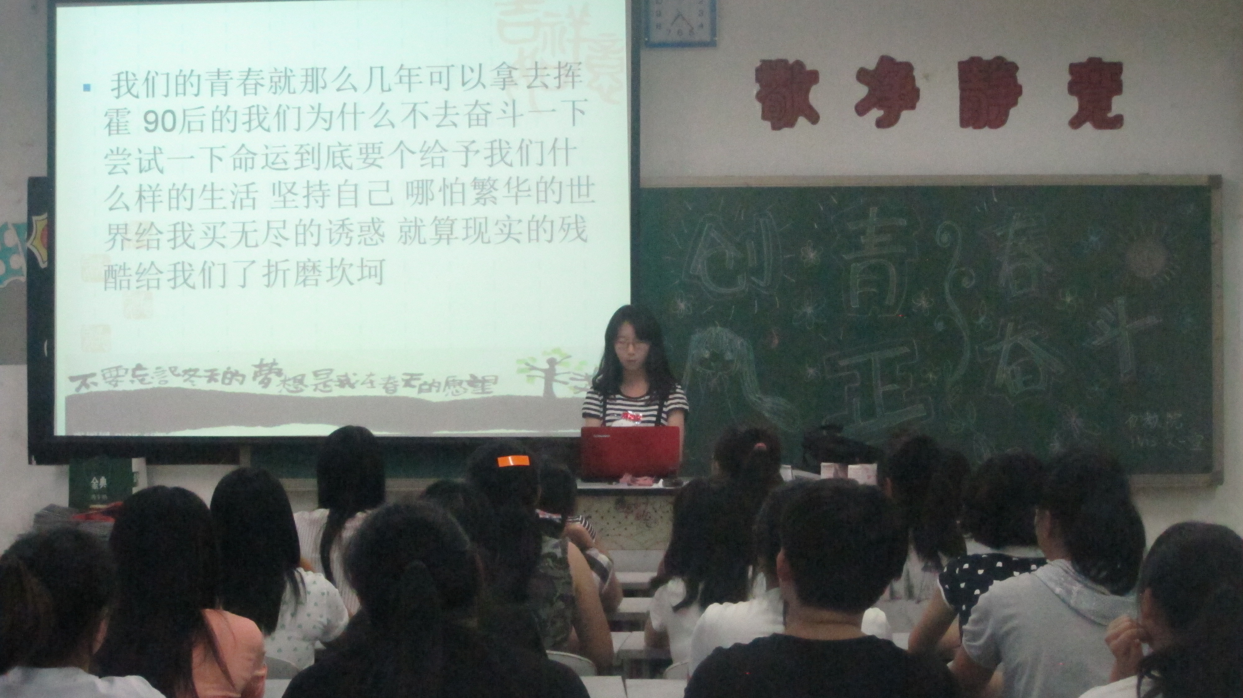 在此次政治学习会议中,五年制的同学们踊跃发言,其中一个学生代表在发言中不仅向大家阐述了自己的短期目标和远大理想,还说明了自己的短期计划与长期打算,最后还发表了慷慨激昂,振奋人心的演讲——《青春在奋斗中闪光》,赢得了同学们热烈的掌声。三年制的同学则通过视频和PPT的形式向大家展示了众多大学生的创业故事,这让在座的同学们意识到就业的艰难,竞争的激烈与创业的艰辛。同时也更加激发了同学们为青春,为理想而奋斗的热情。