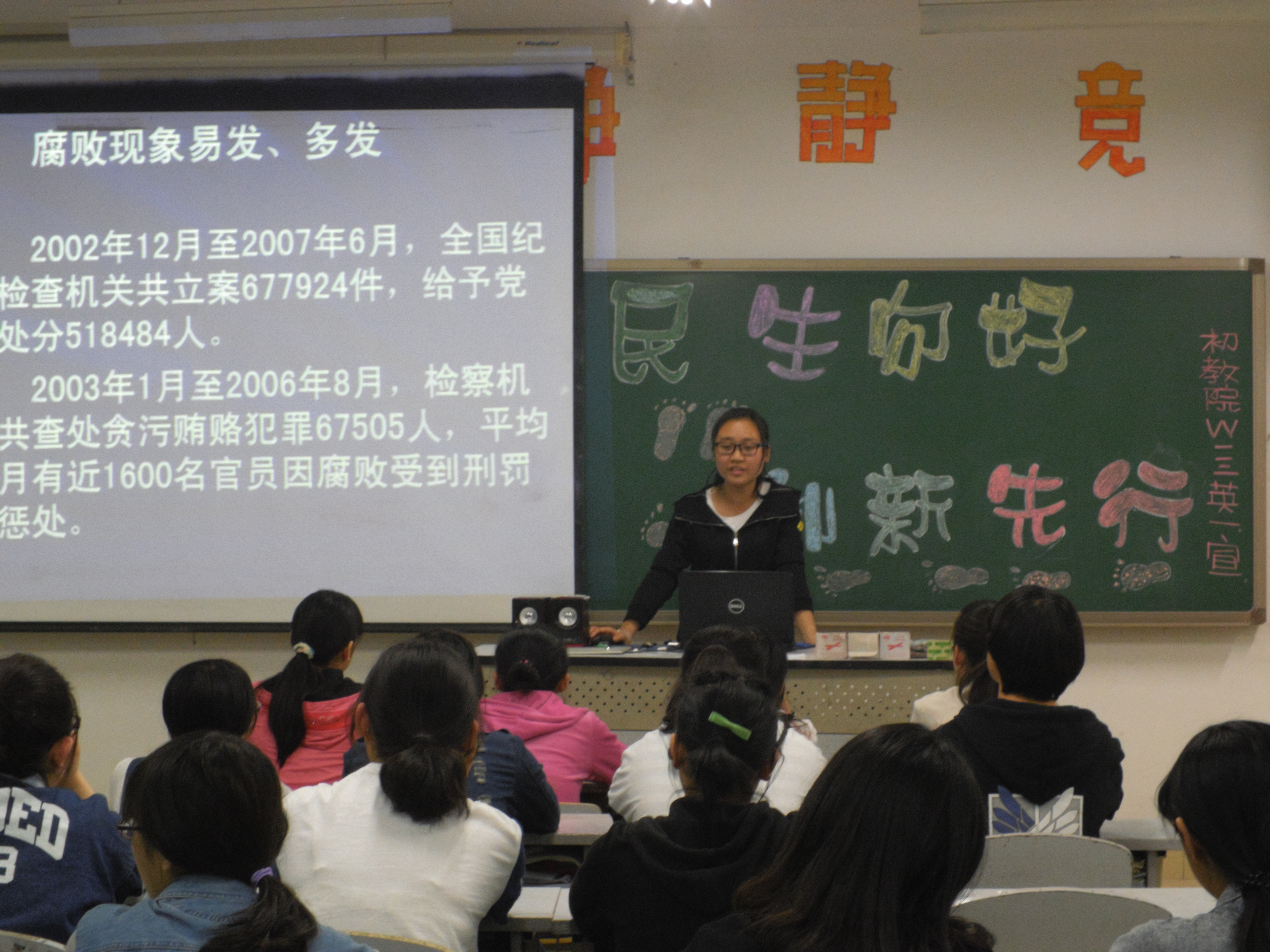 此次政治学习活动主要提及“就业、教育、分配、社保、稳定”五大民生问题,这充分展现了我院同学关注民生,关心时政的爱国情怀。初教院全体同学将在今后的学习生活中保持这份情怀,努力成长为与时俱进,开拓进取的当代优秀大学生。