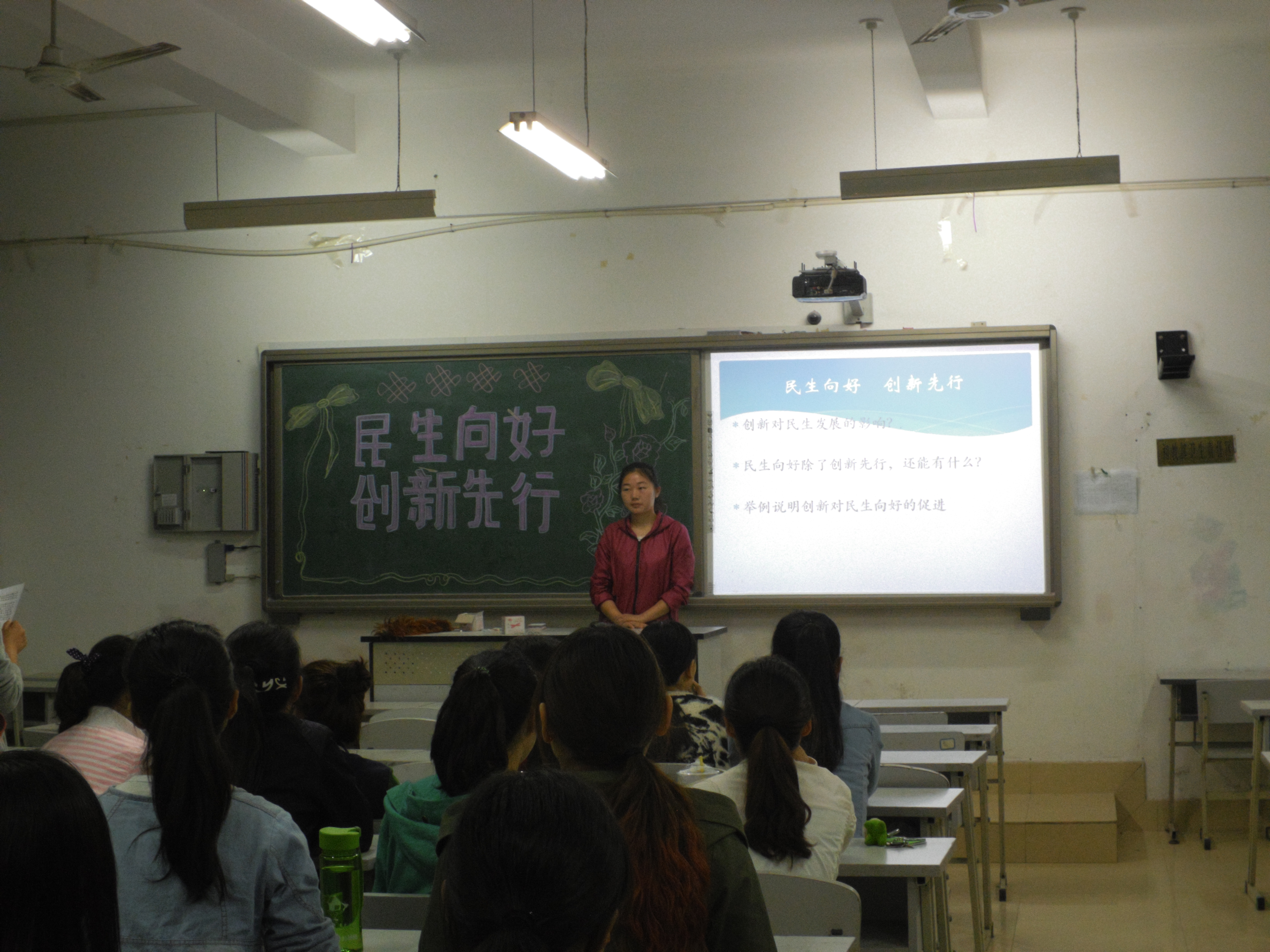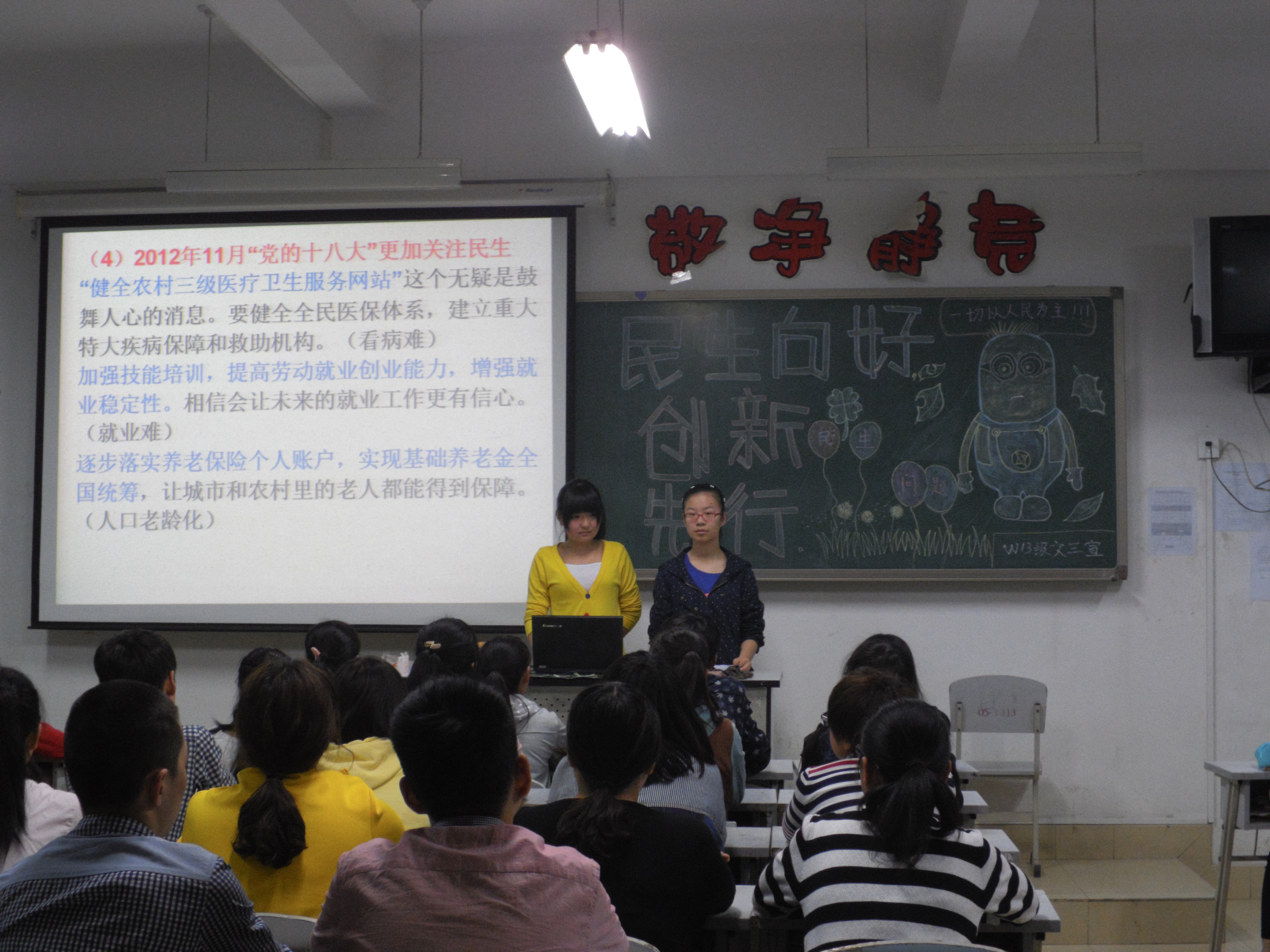 会议中,各班同学紧紧围绕“邓小平理论”“三个代表重要思想”“科学发展观”以及“党的十八大精神”等话题展开深入探讨。其中,13级四年制语文班同学就民生的六大方面发表了自己的见解,最后总结出农村发展要以促进农民增收,百姓得实惠为主,就业乃民生之本等结论。五年制同学则主要讨论了创新对民生发展的影响,还通过视频资料了解了建立农村三级医疗服务站、完善农村养老保险、开展农民工技能培训等惠农政策的显著成效。