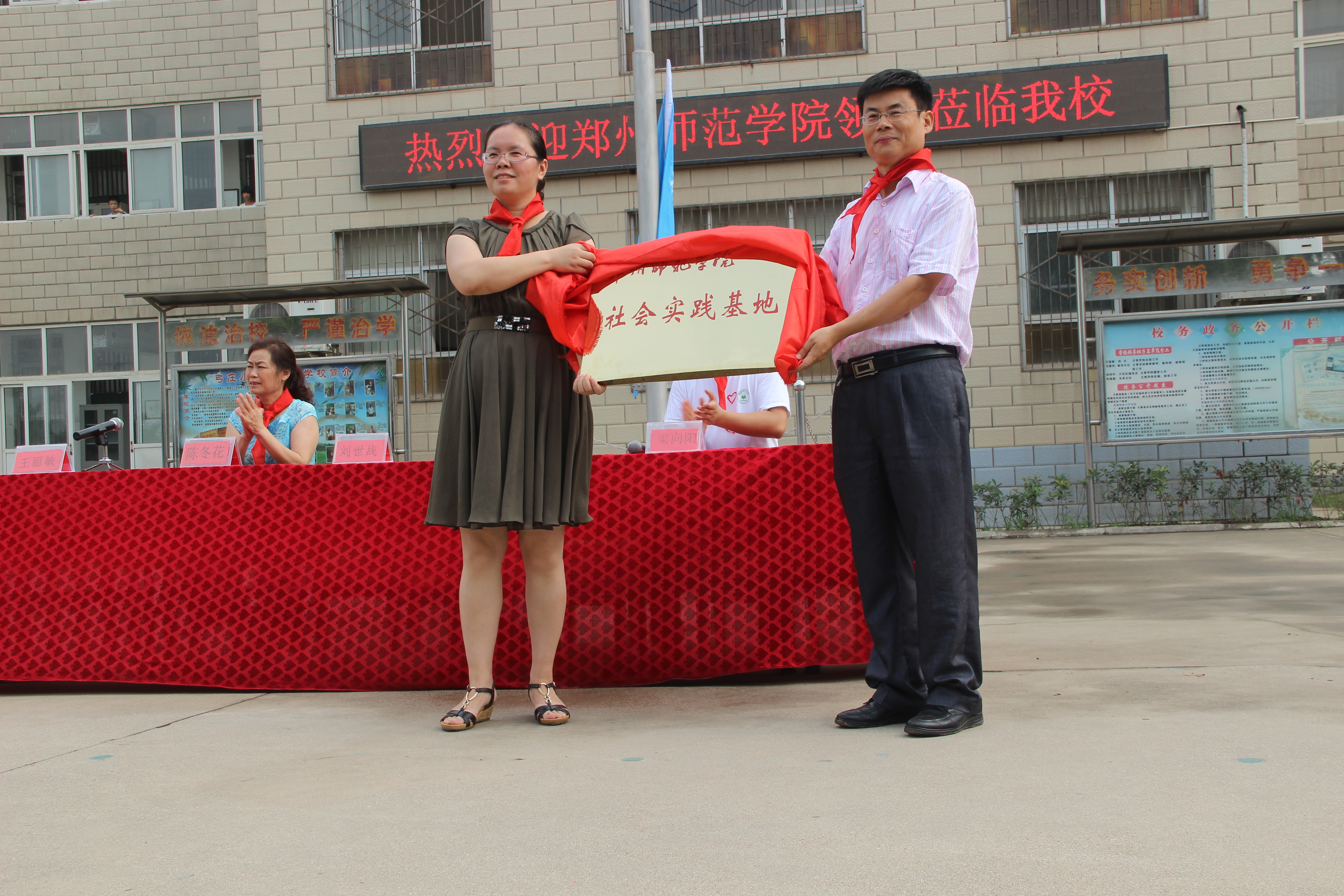 大会首先由弓庄小学的学生代表为出席的领导佩戴红领巾,其次由郑州师范学院陈冬花院长和弓庄小学校长王丽敏作重要讲话,陈冬花院长为弓庄小学进行了 “郑州师范学院暑期社会实践基地”授牌仪式,表达了对新时代少年的期望,鼓励他们努力学习、发奋读书、不辜负领导的殷切希望,长大后成为祖国的栋梁。会后,我院领导亲切慰问了暑期支教同学,并参观讲课风貌,对支教作品的成果展示给予一致好评,鼓励支教同学继续努力,将爱心传递下去。