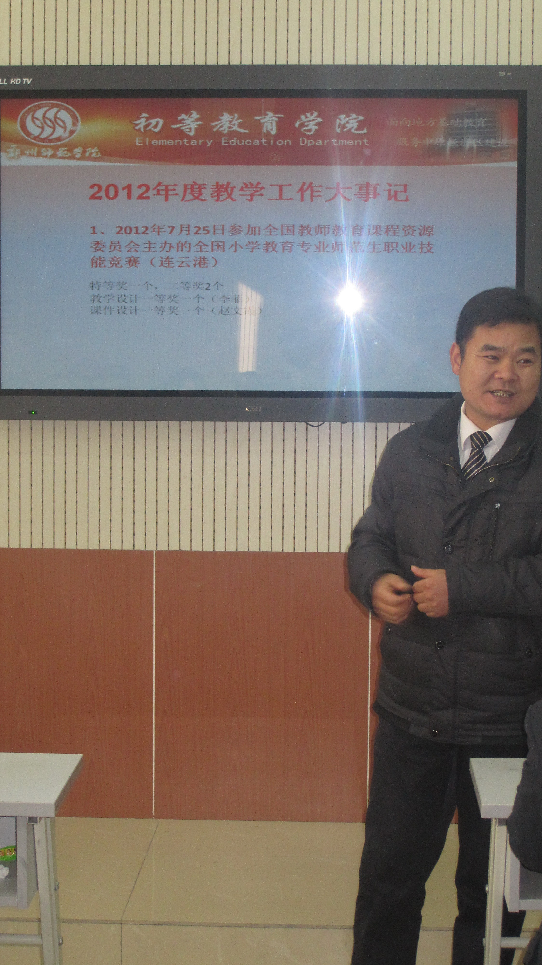 侯宏业副院长受陈冬花院长的委托,首先对2012-2013学年第一学期教学工作进行了回顾总结。侯院长从常规教学、取得的成就、存在的问题、对未来的展望等方面对教学工作做出详细梳理。侯院长在总结中说,本学期各项工作在各位老师的共同努力下圆满结束,教学工作进展顺利,在各种教学比赛中也有斩获,专业建设也逐步向高层次迈进。但在教学工作中也存在着亟待改进的问题,相信在今后的工作中,初教院必将在老师们的努力下获得更快发展。