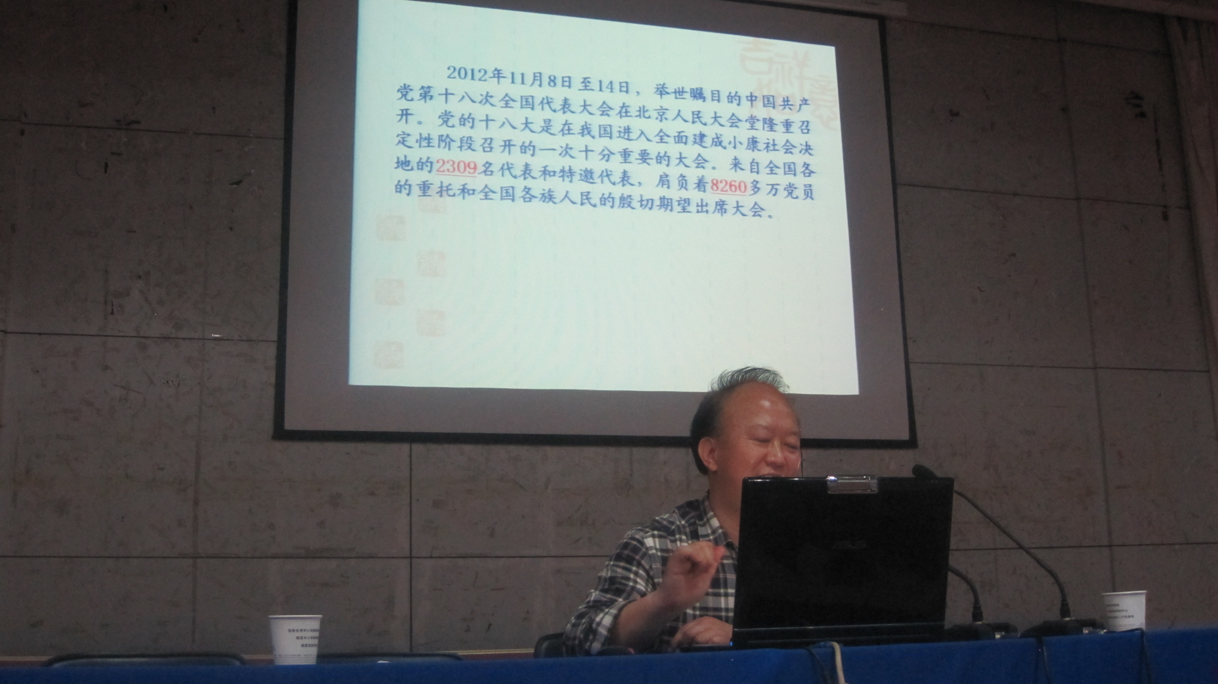龚教授从“十八大”报告起草背景,过去工作的墓本总结,全面建成小康社会目标,加快转变经济发展方式,扎实推进文化强国建设,推进政治体制改革,生态文明建设和全面提高党的科学化水平等方面对“十八大”精神作了全面朗读。报告用了大量有说服力的具体数据,直观易懂,内容丰富,深入浅出有高屋建瓴。龚教授还把“十八大”报告与中原经济区建设结合起来,与大学生政治思想教育结合起来,贴近实际,贴近生活,富有感染力,收到良好效果。