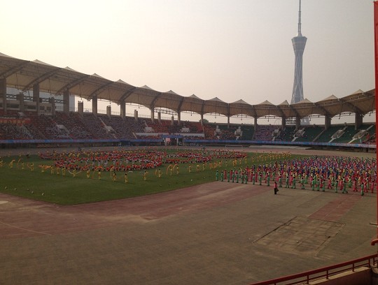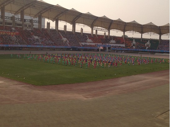 尽管天气炎热、干燥却挡不住观众们观看的热情。四点钟开幕的活动,我们全体同学三点钟就到观众席并且准备就绪了。