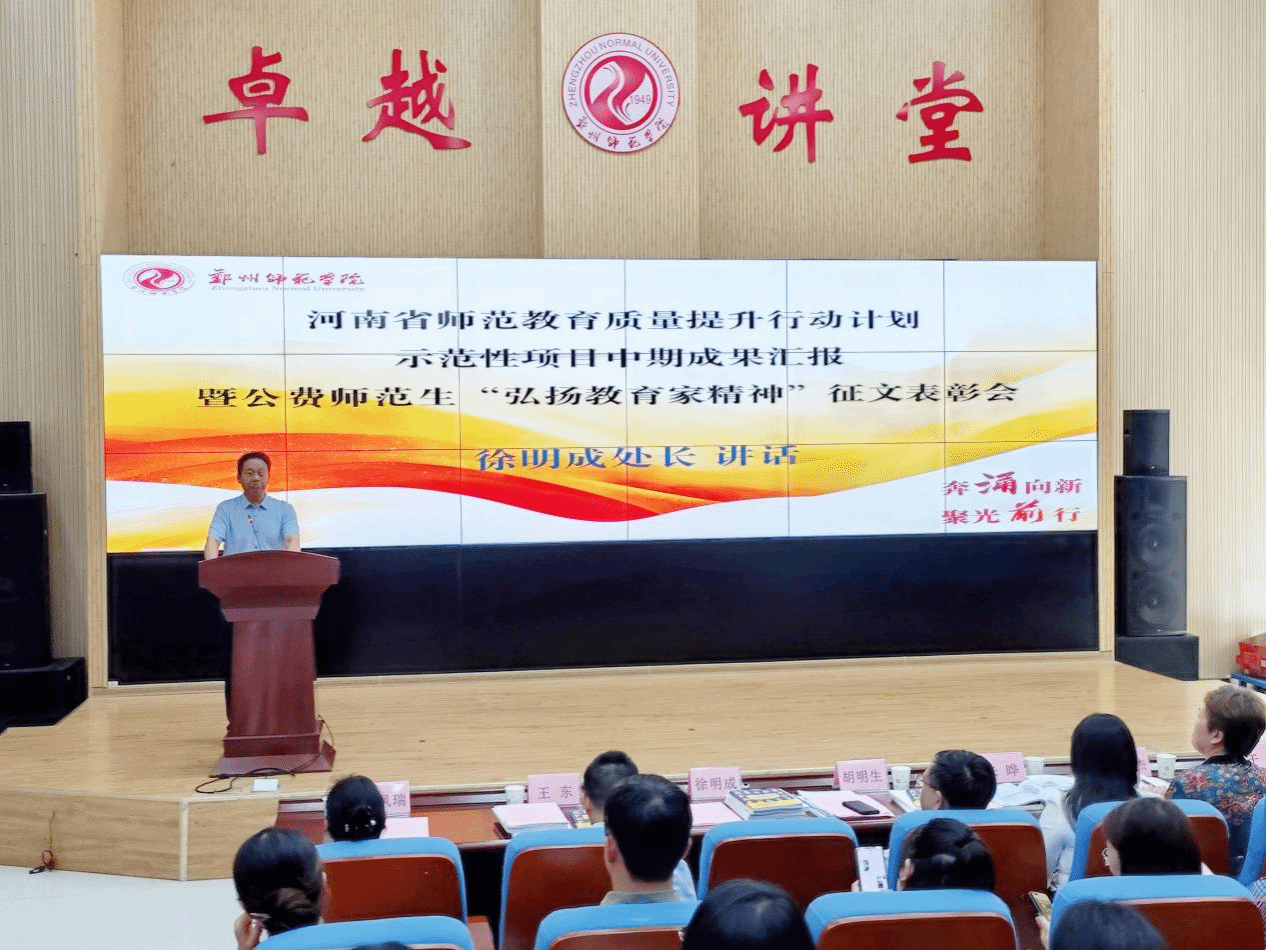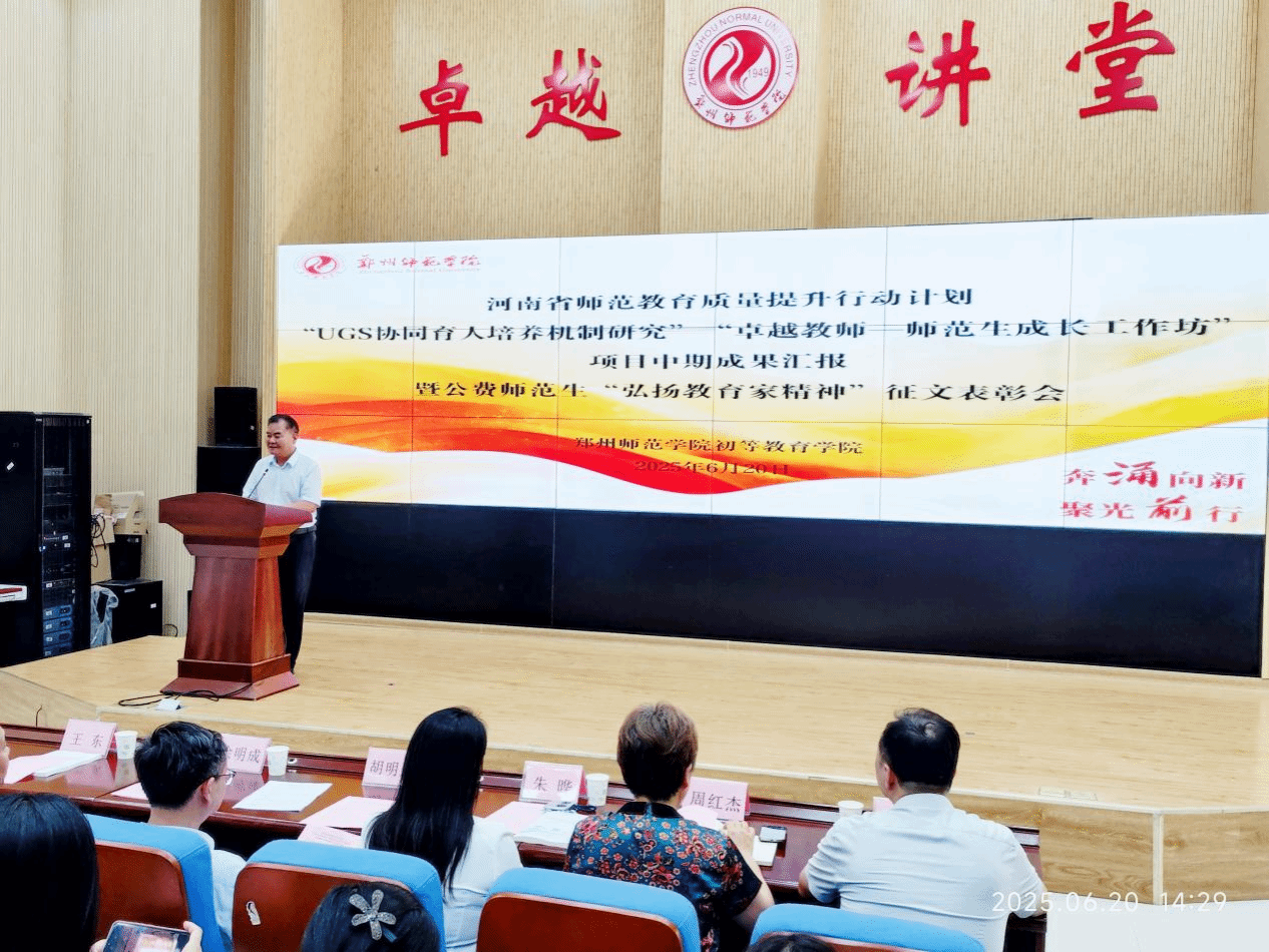6月20日下午,郑州师范学院初等教育学院承担的河南省“师范教育质量提升行动计划”示范性项目“UGS协同育人培养机制研究”“卓越教师—师范生成长工作坊”项目中期成果汇报暨公费师范生“弘扬教育家精神”征文比赛表彰会在“卓越讲堂”成功举办。副校长胡明生、教务处、学生处负责人、教育学部部务委员会成员以及来自基础教育一线近20所名校的名师和我校师生齐聚一堂,共同回顾项目实施一年来的建设成就。