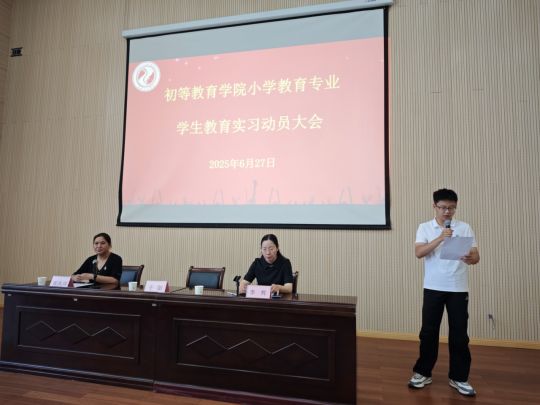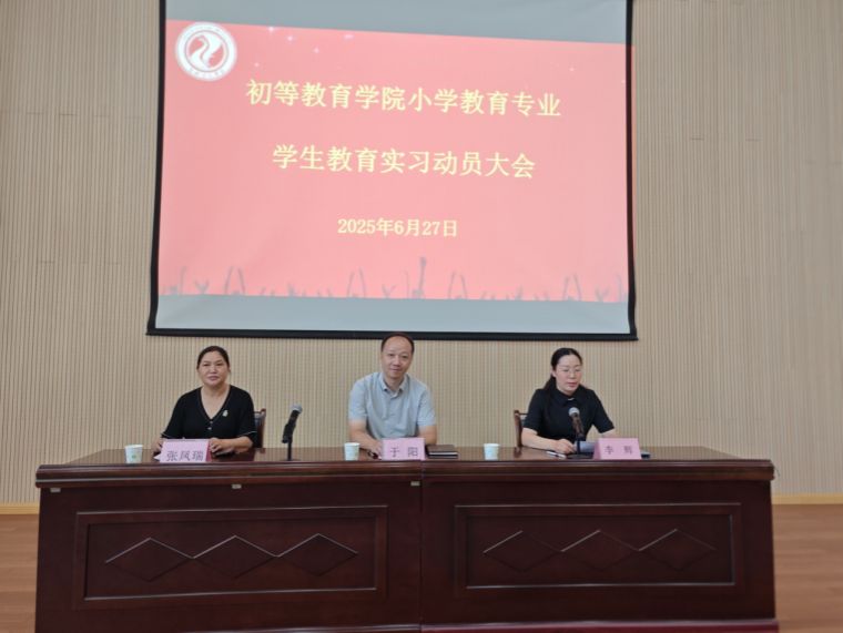 为确保教育实习工作有序开展并取得实效,2025年6月27日上午,初等教育学院2022级小学教育专业教育实习动员大会在嵩山学堂第二报告厅顺利举行。初等教育学院党总支副书记于阳、副院长张凤瑞、实习工作负责人朱文彬、实习年级辅导员李辉,以及2022级小学教育专业学生331人出席动员会。本次大会旨在明确实习要求、凝聚师生共识,为即将开启实习之旅的同学们奠定坚实基础。