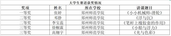 郑州师范学院教育学部初等教育学院B22小学教育(数学班)邓静、B22小学教育(全科1班)徐帼霖、B23科学教育(公费师范生1班)李宝蕊、张婷、B23科学教育(公费师范生2班)高翱宇,凭借优秀的教学功底和精心的教学设计,荣获一等奖1项、二等奖2项、三等奖2项,充分展现了我院师范生扎实的专业素养与出色的科技教育实践能力。